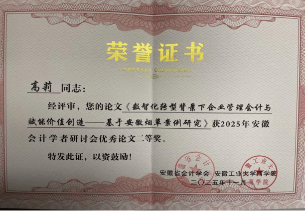 研讨会上,公司高莉老师汇报了撰写的论文《数智化转型背景下企业管理会计与赋能价值创造—基于安徽烟草案例研究》。该论文围绕“数智化转型背景下的企业管理会计创新”展开深入研究,系统梳理了相关领域的研究现状,通过案例分析、实证研究等方法揭示了关键问题与解决路径。论文得到了与会专家的一致好评,荣获研讨会“优秀征文二等奖”。