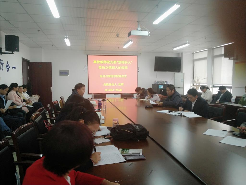 11月6日下午,经管公司在902会议室召开全体党员大会,党总支书记沈辉讲授了题为:高校教师党支部“双带头人”要做立德树人的表率的专题党课。