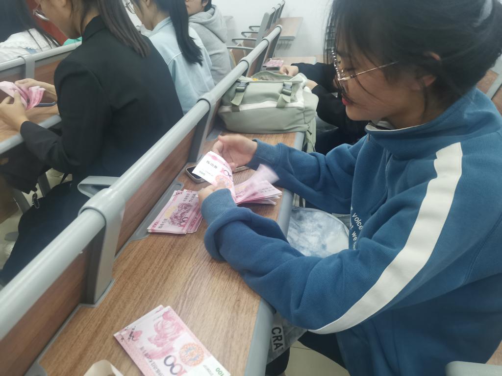 本次活动的目的在于提高同学们的专业技能,培养专业素质,丰富同学们的课余生活。活动开始,主持人介绍比赛规则和注意事项,参加比赛的同学在候场区等待,相关的规定与流程已经仅由裁判员说明同时员工计时员及时配好位置,学习部的有关人员一切准备就绪,一场激烈的比赛正式开始接着一轮与一轮的比赛选手充满自信与活力地进入比赛场地。比赛采用单指单张、多指多张点钞法,要求在规定时间内完成点数、计数等多道工序,既检验参赛选手的点钞速度,还要求点钞的准确性。随着主持人的一声令下,计时员开始计时,选手们也开始点钞,每位同学点钞的手法及手势都各不相同,但他们点钞的速度都非常快,在激烈争夺的比赛中,教室只听见点钞纸滑过指尖的沙沙声,选手们都飞速地挪动手指,全神贯注于手中的纸钞。