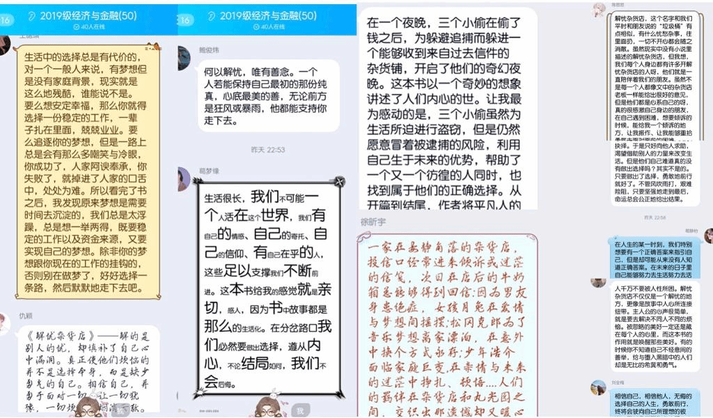 班级员工们围绕小说《解忧杂货铺》展开了讨论。首先由学习委员葛静怡同学介绍了小说的核心内容,之后同学们对小说的主题及传达的内容表达了自己的见解。