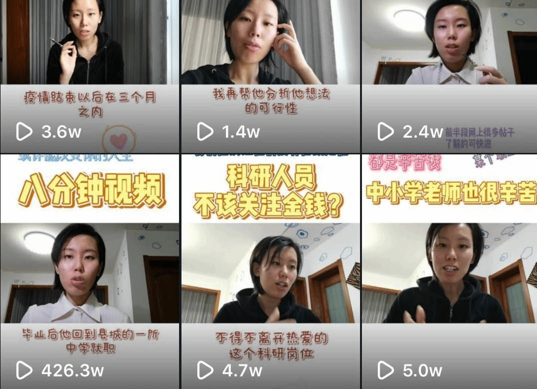 2月2日,她录了一段8分钟的视频,讲述了她身边一名普通教师的成长故事,经历过高考落榜、非典等困难最终达到了自己的人生目标,这条时长不短的短视频获得了417.6万的观看量,收获了10.7万的点赞量。