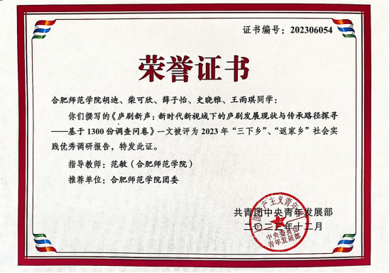 近日,共青团中央青年发展部发布《2023年度“三下乡”“返家乡”社会实践优秀调研报告拟入围名单公示》,WilliamHill中文官方网站学子胡迪、柴可欣、薛子怡、史晓雅、王雨琪同学撰写的社会实践调查报告《庐剧新声:新时代新视阈下的庐剧发展现状与传承路径探寻--基于1300份调查问卷》(指导教师:范敏)成功入围,喜获国家级奖项新突破(全国共120项)。