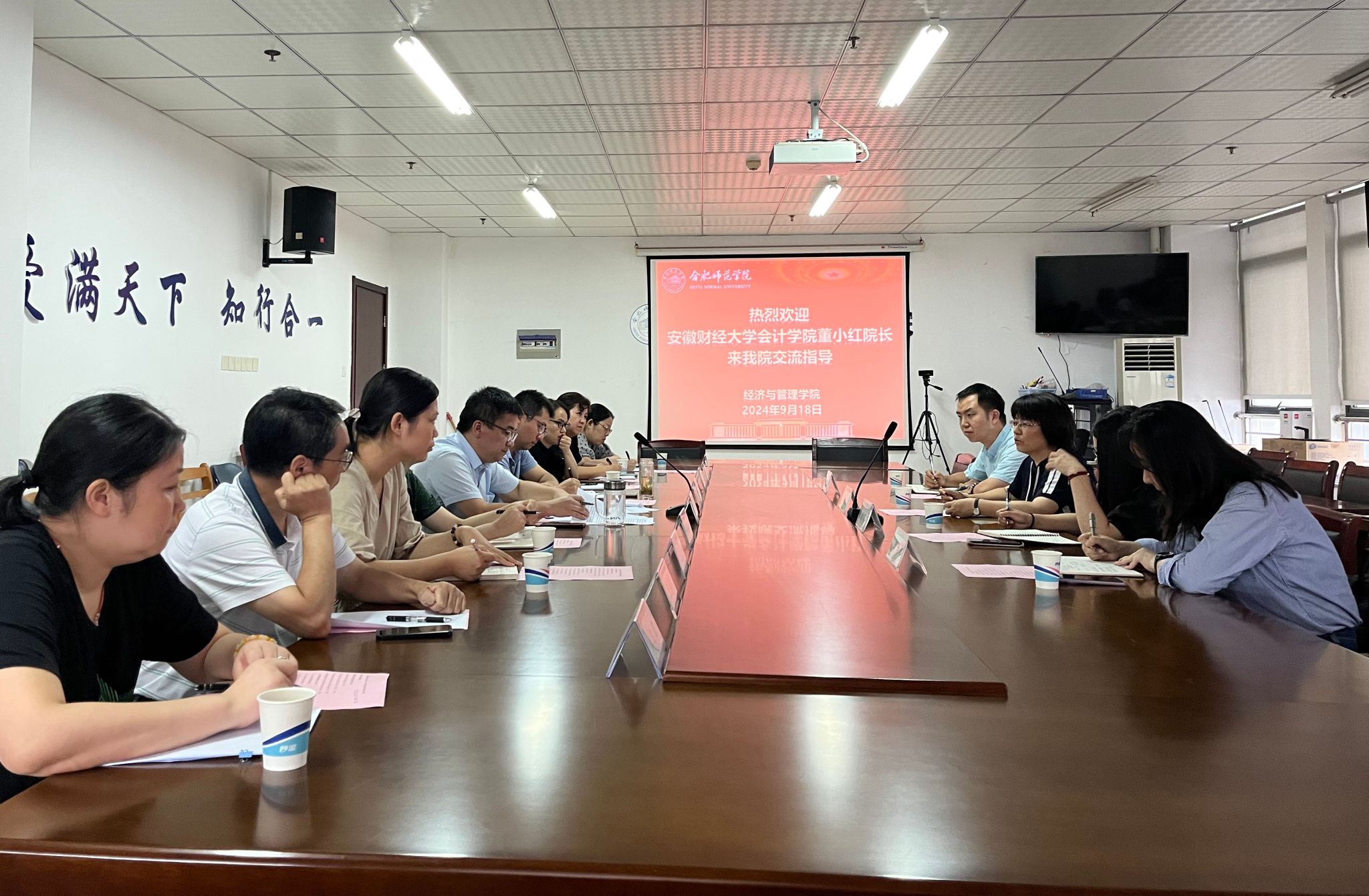 9月18日,安徽财经大学会计公司副经理董小红教授一行四人应邀来经管公司调研交流经管类学科发展以及团队队伍建设工作。经管公司党委书记陈好、副经理钟玉文以及各系部负责人参加调研。会议由陈好主持。