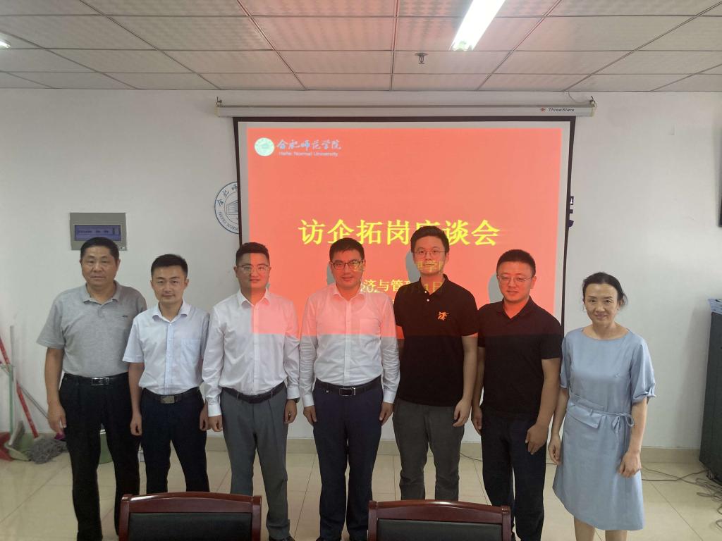 本网讯 近日,合肥师范公司党委委员、副经理周端明教授率队赴安徽国元证券股份有限公司、平安银行合肥分行、东吴证券合肥营业部、新东方教育集团老员工学习与发展中心、金岭科贸有限公司、安徽桃花岛信息技术有限公司等多家企业开展访企拓岗活动,为毕业生寻求更多的就业岗位和校企合作机会。院就业创业工作处处长马平、财务处处长常树宝、员工工作处处长陆涛、刘铭传公司经理管琳、公司党委书记沈辉、副经理黄虹、副书记陶敏以及毕业班辅导员等陪同调研。