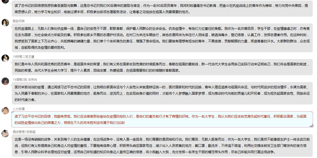 2018级经济与金融班黄瑶说,习近平总书记给90后党员的重要回信,对新时代的青年给予了充分的肯定。作为青年一代的我们,在这次的疫情斗争中,我积极报名成为一名志愿服务者。在参加疫情防控志愿服务的过程中,在路口认真记录来往车辆的通行信息,做好体温检测,尽自己的绵薄之力为疫情的防控带来帮助。我们团员青年用行动证明,新时代的中国青年是好样的;用实际行动证明,在灾难来临时,我们会毫不犹豫的站出来、奉献自己。