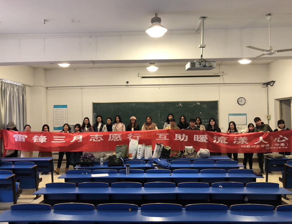 2018年3月,16级财务管理中美合作班积极响应校团委的号召,发动同学们开展“雷锋三月行”活动。我们与合肥志愿者联合会达成合作,在校园内举行了“学雷锋献爱心”募捐活动。