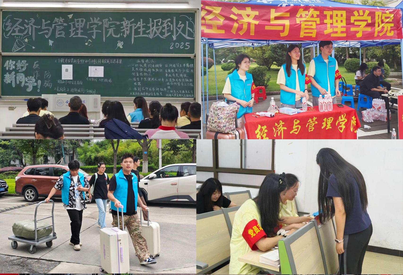 初秋的校园彩旗飘扬,迎新气氛喜庆热烈。晨曦微露,经管公司工作人员早已在锦绣和滨湖两个校区各迎新点位就位。他们身着统一的服装,以饱满的热情投入工作,忙碌而有序地协助新生办理各项入学手续——从身份验证、材料提交,到宿舍引导、校园卡办理,志愿者们始终面带微笑、耐心解答。不少党员志愿者除了帮助搬运行李之外,还主动分享学习和生活经验,帮助学弟学妹们更快熟悉教学楼、食堂、图书馆等场所,传递出浓浓的朋辈关怀情谊。